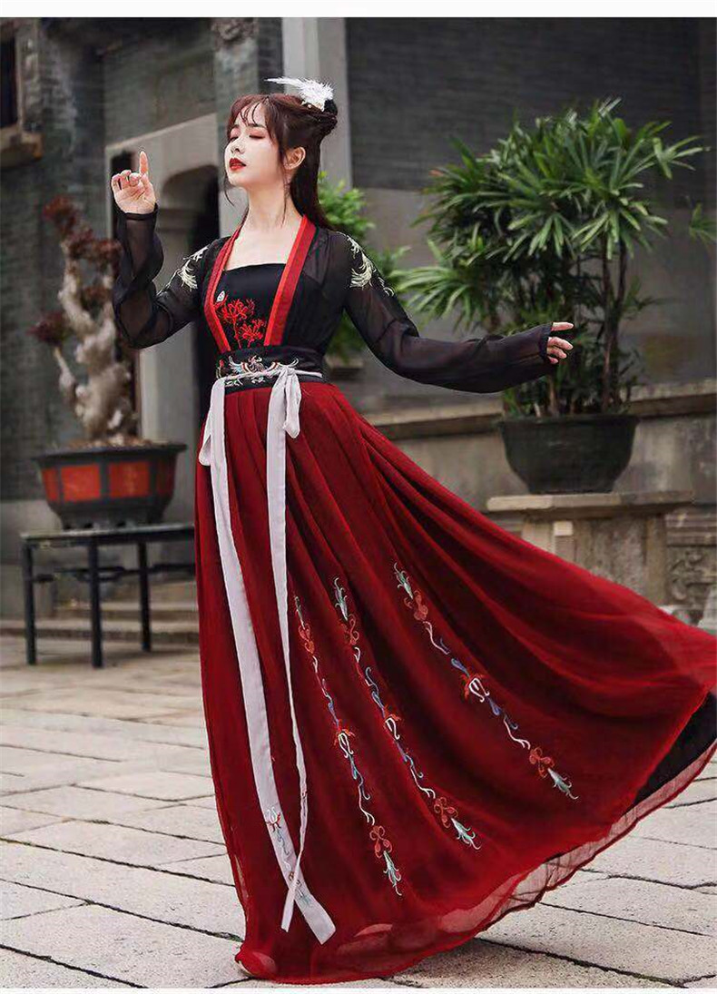 新时尚汉服女黑红系色成人学生齐腰襦裙古风年会表演服演出服古装送